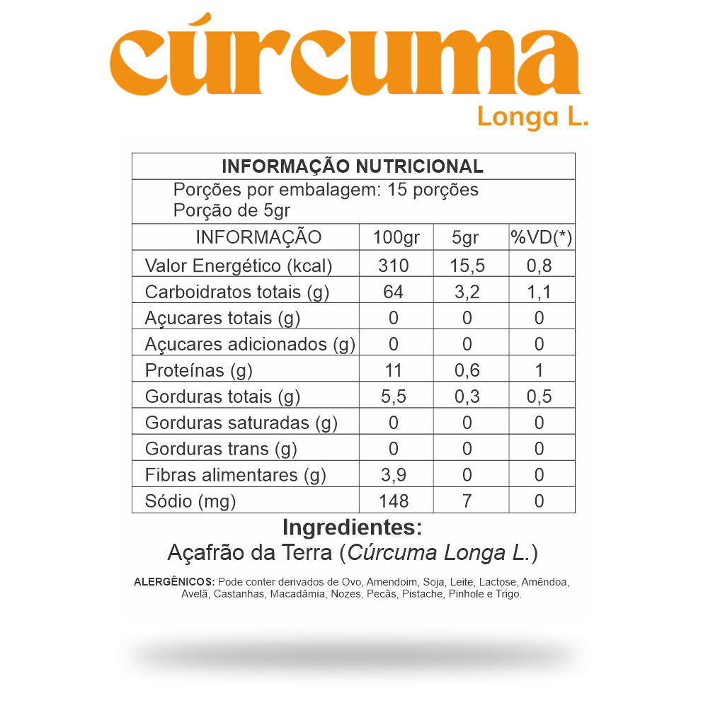 A cúrcuma, conhecida por suas propriedades anti-inflamatórias e antioxidantes, é 100% pura e vem em pó, ideal para uso culinário ou em tratamentos naturais.